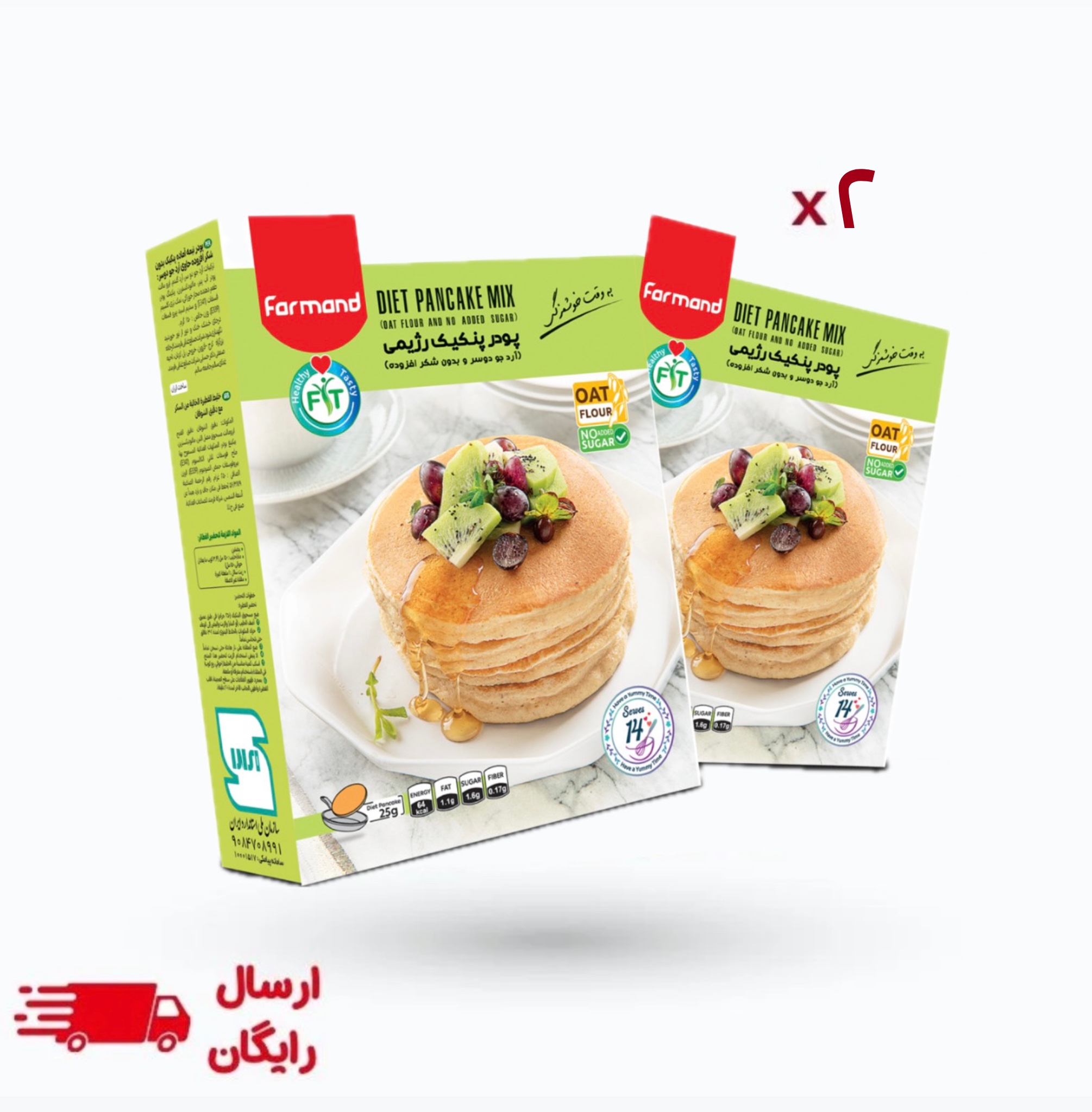 پک دو عددی پودر پنکیک رژیمی فرمند، بدون شکر و رژیمی، سرشار از پروتئین، انتخابی سالم و خوشمزه برای رژیمهای لاغری و صبحانهها و میانوعدههای پروتئینی ورزشکاران